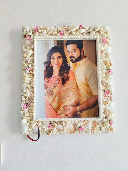 Handcrafted Seashell Photo Frame with Floral Accents – Coastal Elegance for Cherished Memories