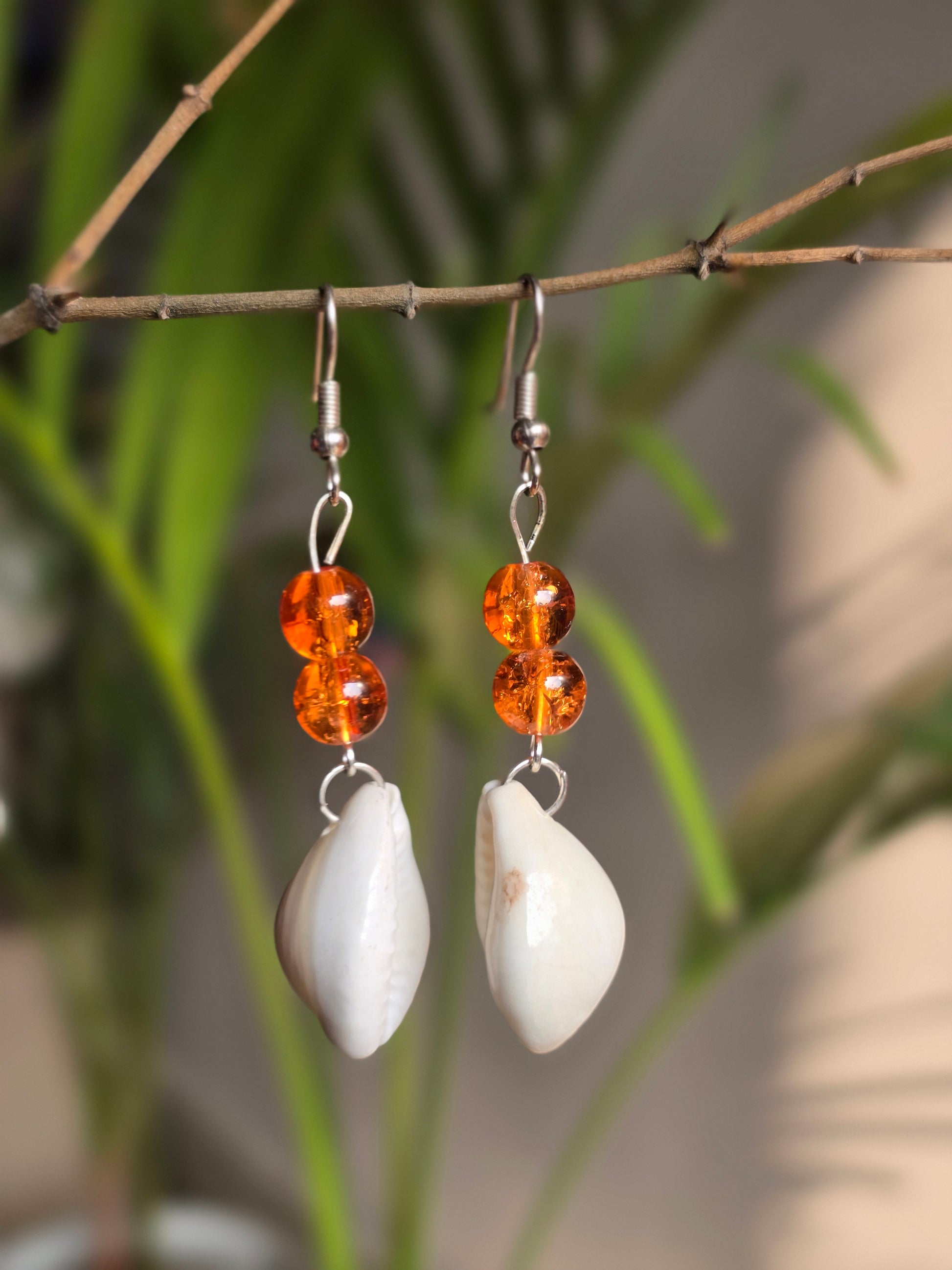Nature-inspired elegance to your look with these handcrafted cowrie shell drop earrings, designed for lovers of subtle beauty and boho charm. Featuring natural cowrie shells paired with soft Orange crystal glass beads, these earrings reflect a perfect balance of earthy tones and delicate sparkle.